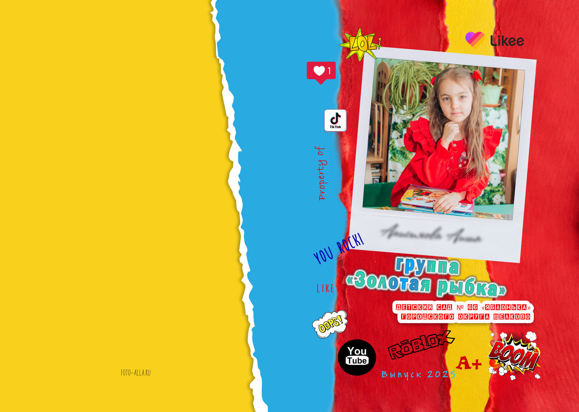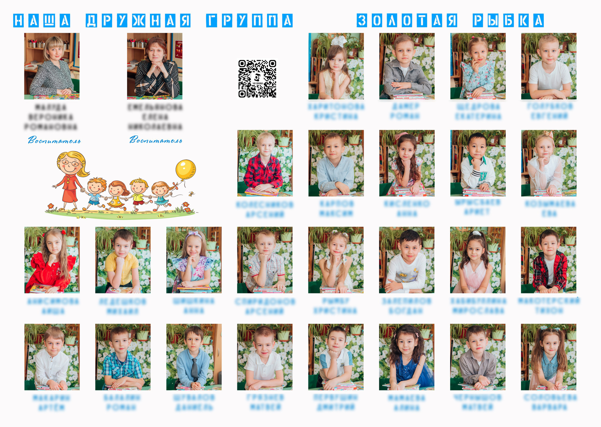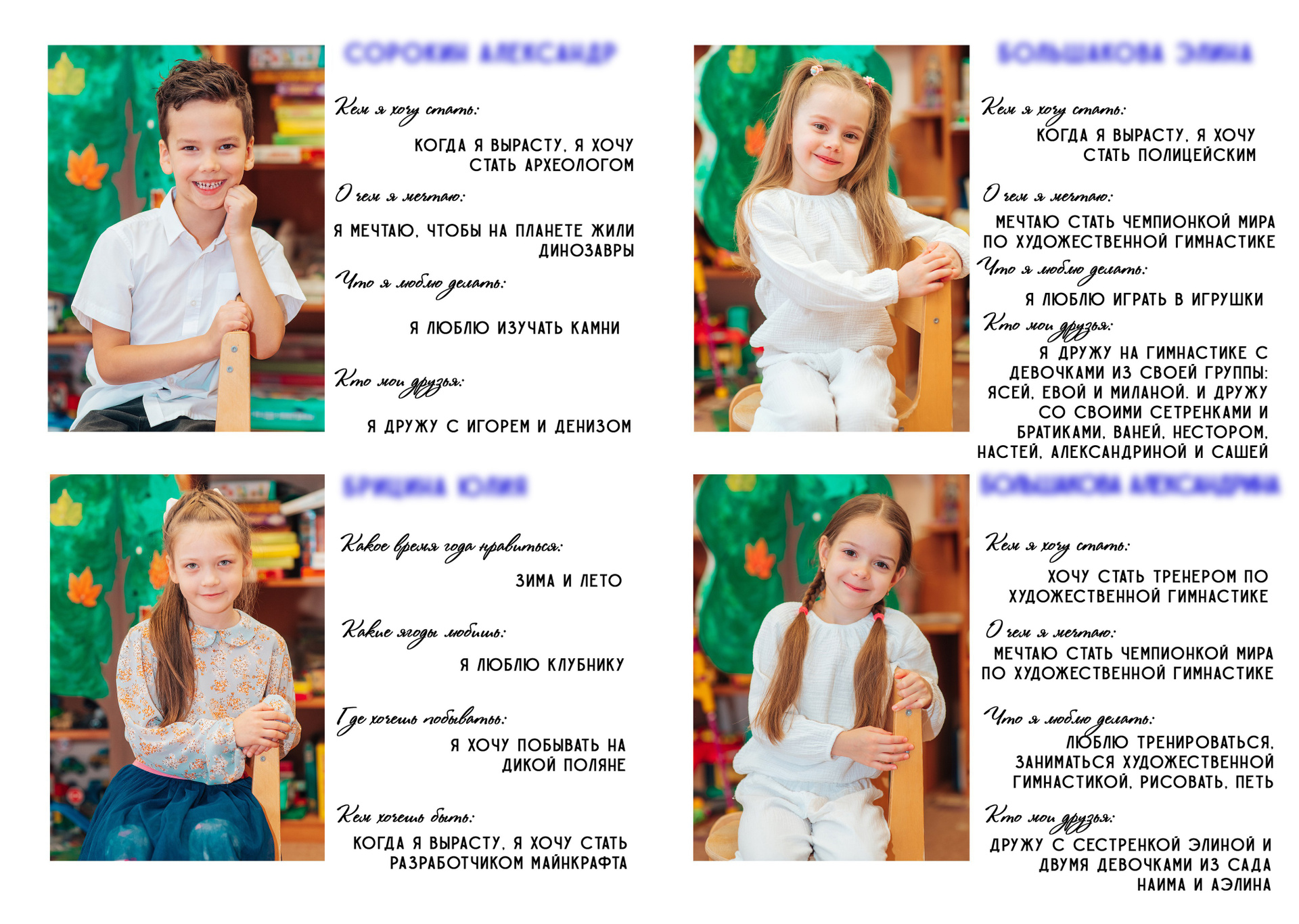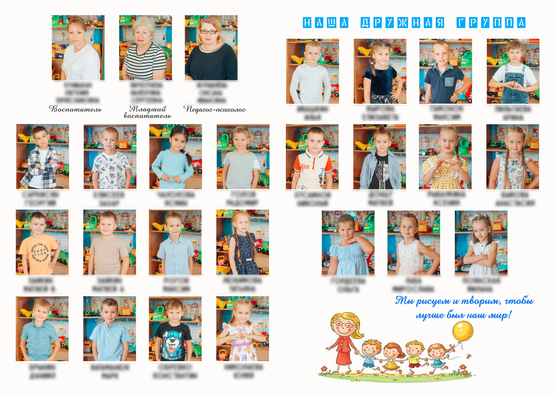 Индивидуальный альбом с анкетой и рисунком от 10 разворотов. Это значит, что на каждой фотографии будет владелец альбома. Количество разворотов зависит от количества детей и формируется так, что бы у вас было 5 индивидуальных разворотов вашего ребенка. В альбом входят 2 оживающие фотографии. Воспитатель + общая фотография с детьми. Может оживать каждый ребенок по договоренности.