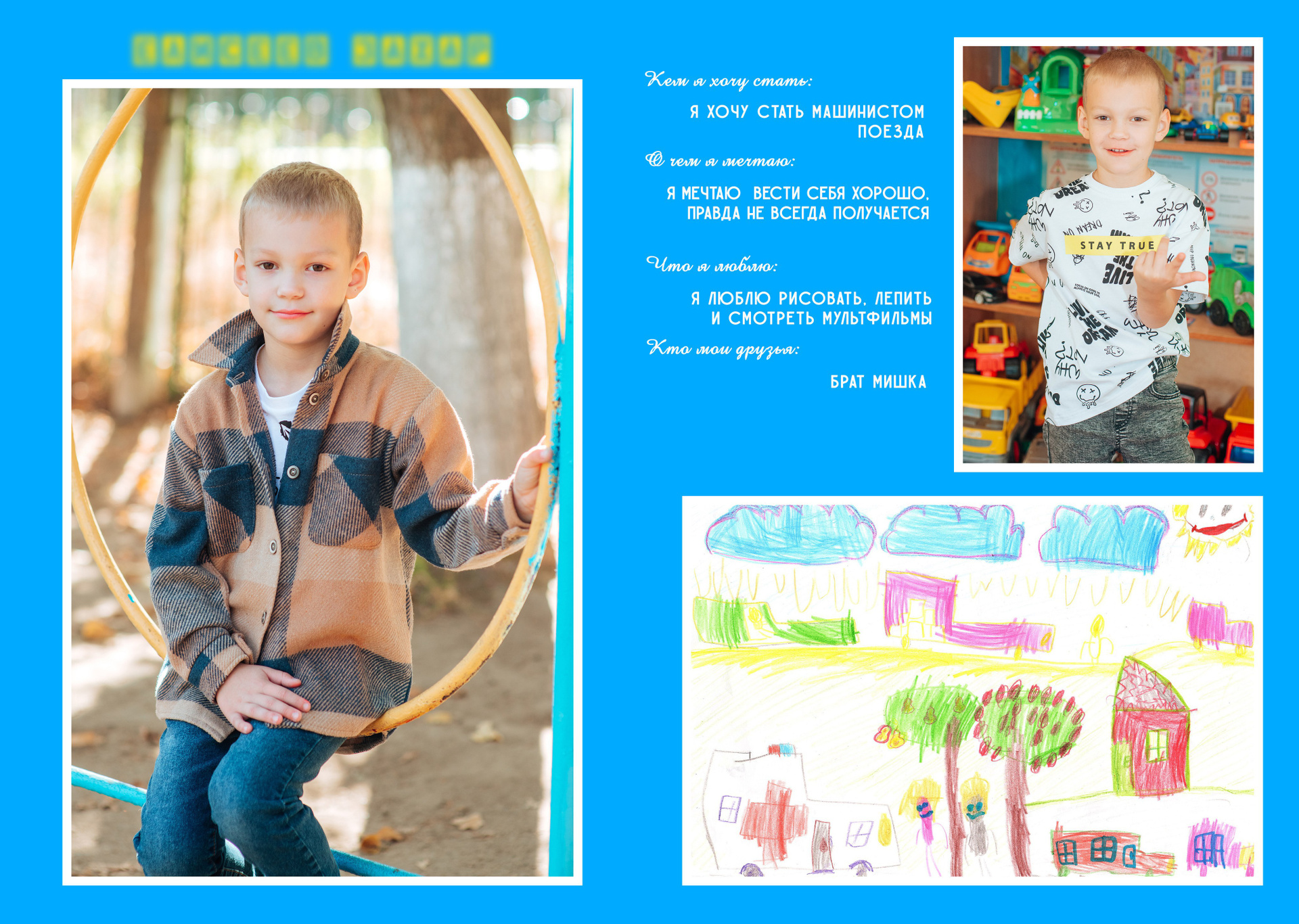 Индивидуальный альбом с анкетой и рисунком ребенка. Это значит, что на каждой фотографии будет владелец альбома. Анкеты и рисунки я собираю в день съемки. Можно сделать разное количество разворотов в группе. от 1 до 5. В альбом входят 2 оживающие фотографии. Воспитатель + общая фотография с детьми. Может оживать каждый ребенок по договоренности. Твердые страницы.